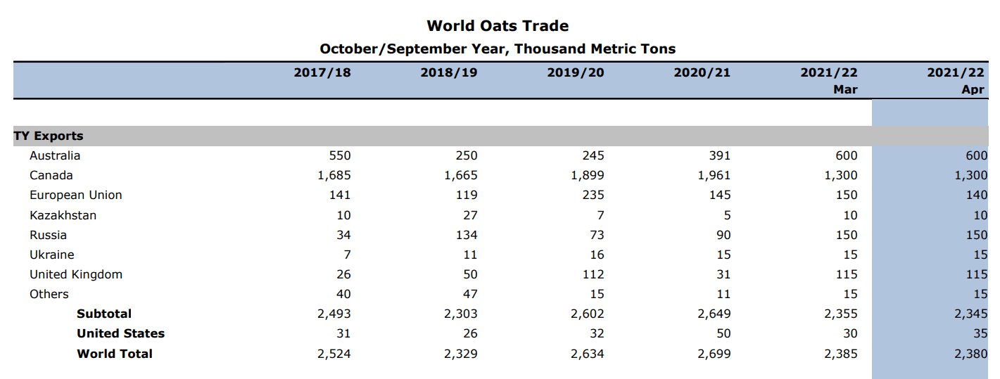 The global oat trade data from April 2022 with Canada still a major exporter of oats. TY = trade year. Source: Foreign Agricultural Service/USDA Global Market Analysis.