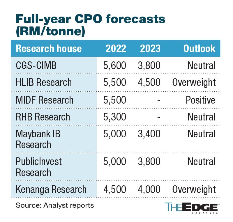 MIDF Research has a full-year average forecast of RM5,500 per tonne for 2022, which is notably at the higher end of the RM4,500 to RM5,600 range expected by analysts covering the sector.