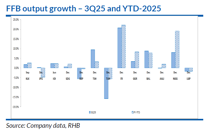 “We maintain a NEUTRAL weighting on the sector,” said RHB. In Malaysia, for companies under coverage, FFB output rose 12.5% QoQ or 0.7% year-on-year (YoY).