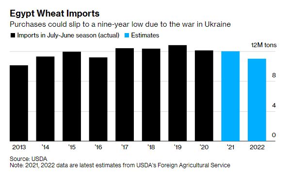 Both Russia and Ukraine have become heavyweights in Egyptian wheat purchases, providing more than 80% of its imports the last five years. That’s been upended in the past two months, with Ukrainian ports largely shut since Russia invaded, stalling seaborne trade. Russian grain is still flowing, although freight rates are surging in the Black Sea.
