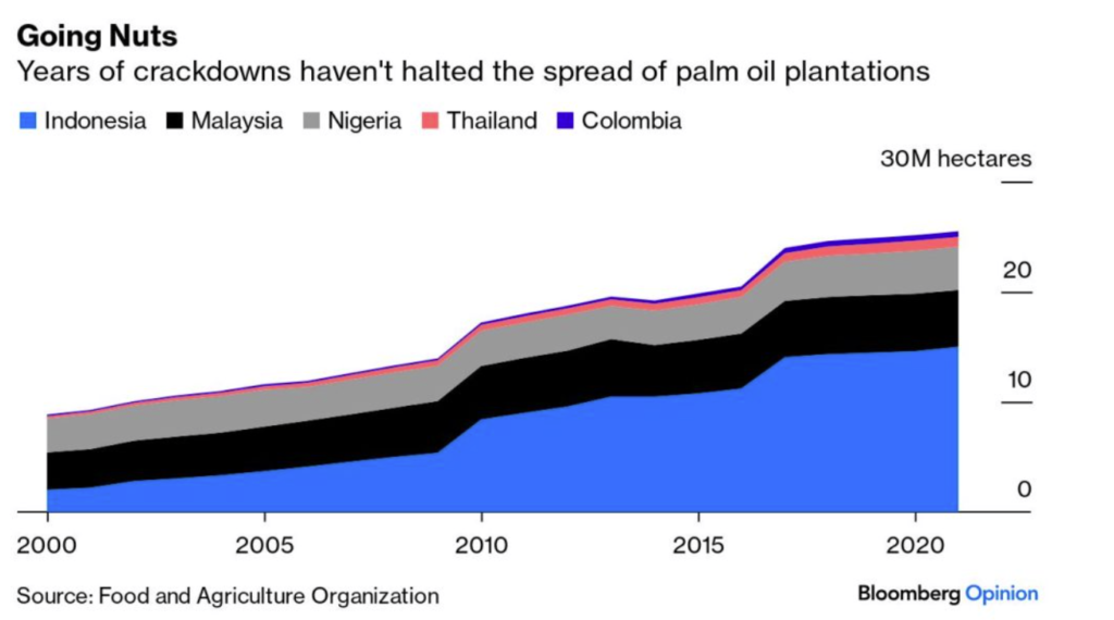 The EU, for decades a top-five consumer of palm oil, has tried to crack down on the trade. The fight is vital to preventing tropical deforestation, which caused emissions equivalent to those from India last year. Food labelling rules were introduced in 2014 and a new anti-deforestation law was passed by Brussels this year, underpinning a promise to phase out palm biodiesel by 2030.