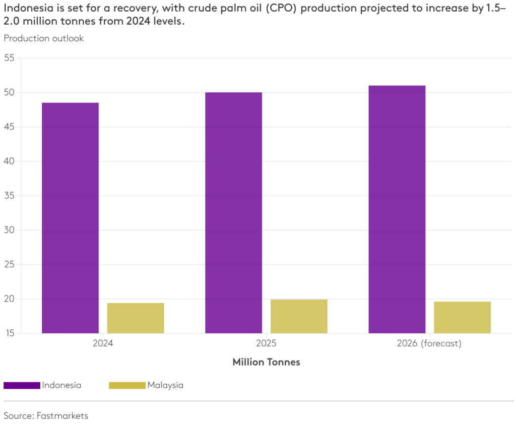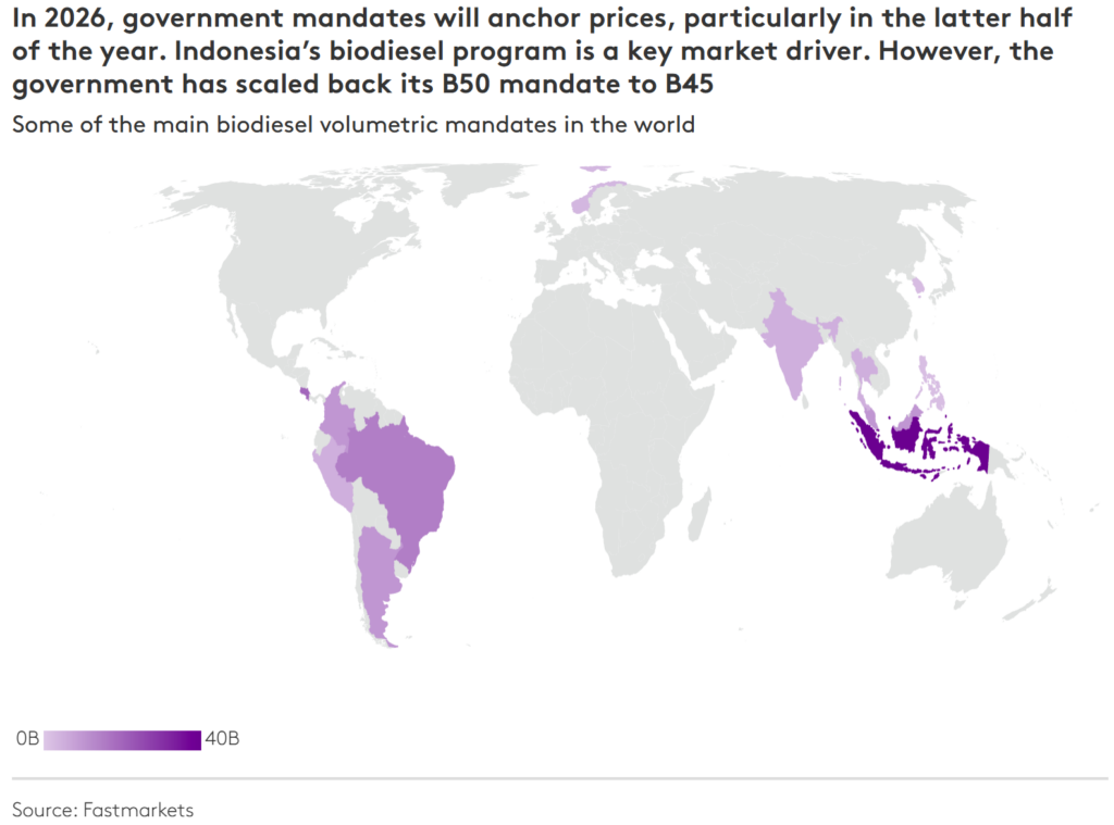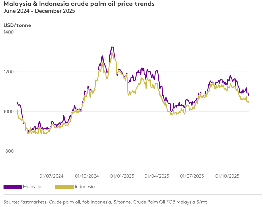 Indonesia’s biodiesel program is a key market driver. However, the government has scaled back its ambitious B50 mandate (a 50% blend of palm oil in biodiesel) to B45 for 2026, citing the need for further consideration. A road test of B50 biodiesel blend was announced in November, with the results due six months later. Market expectation is for the B50 to be implemented in late 2026.
