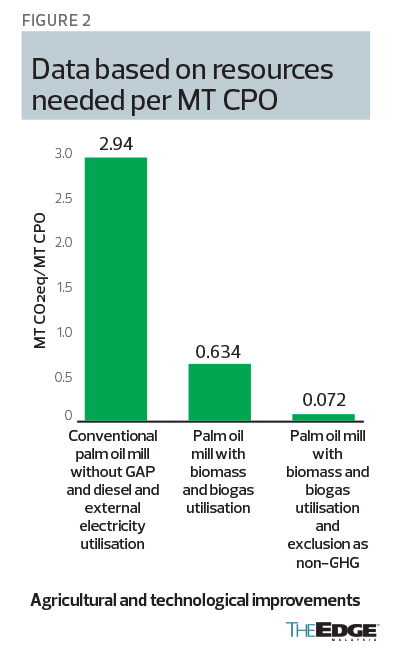Figure 1 illustrates that sustainable palm oil has a significant reduction in GHG emissions compared with conventional palm oil (without good agricultural practices [GAP]). The results of our calculations by taking the plantation and mill as one are shown in Figure 2.