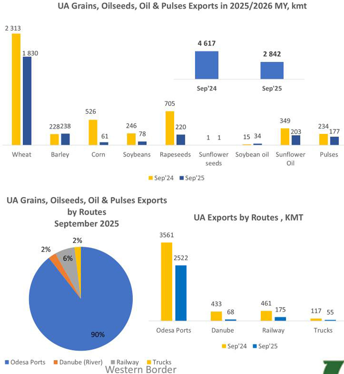 In September 2025, Ukraine exported 2.84 million tons of agricultural products, which is 38% less than the same month last year (4.6 million tons).