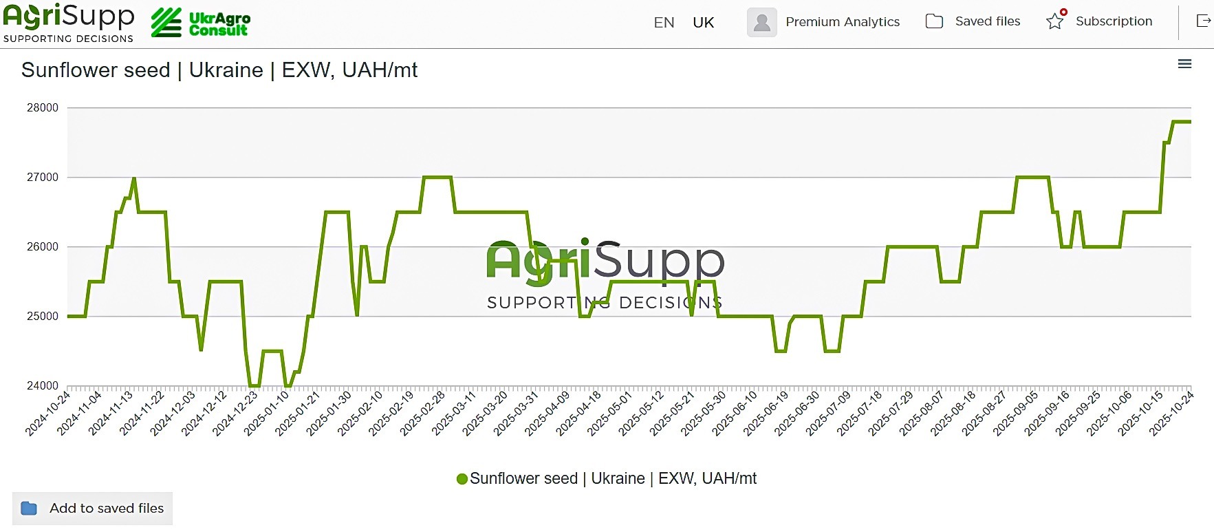 Over the week of October 17 – 24, sunflower prices rose by UAH 300 to UAH 27,800/mt ($663.66/t).