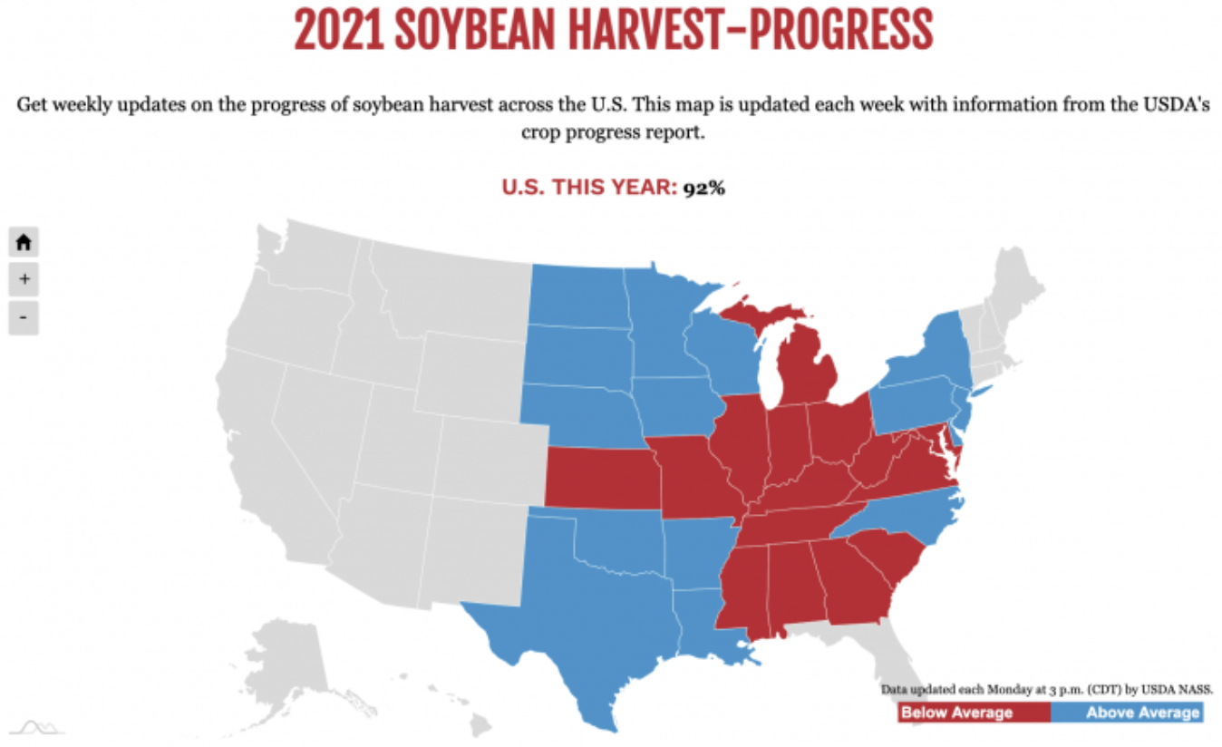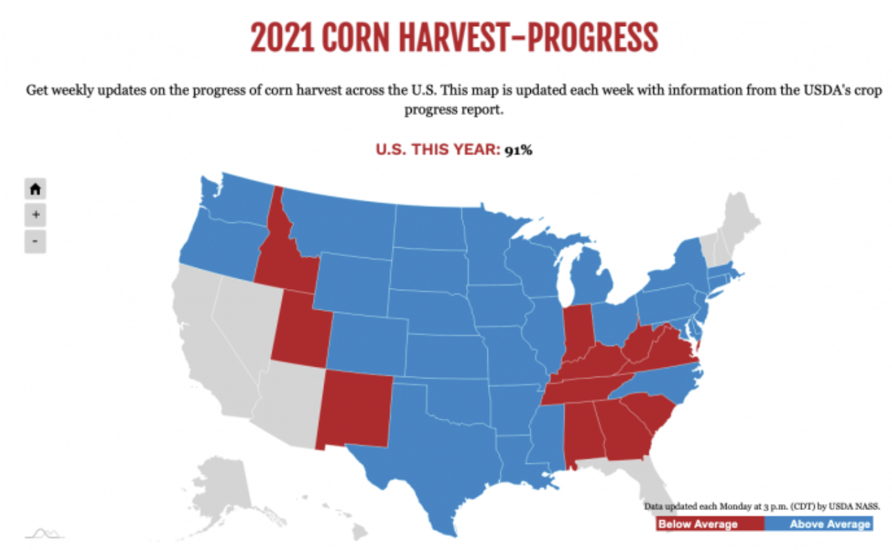 Corn harvest was reported at 95% complete in Illinois, 85% in Indiana, and 91% finished in the final “I-state,” Iowa. Rains that swept across the Corn Belt late last week are likely the cause of any delays as farmers finish for the season.