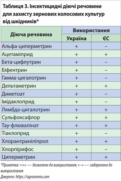 На відміну від фунгіцидних діючих речовин, більшість з яких дозволені в Європейському Союзі, інсектициди в переважній більшості там заборонено (табл. 3).