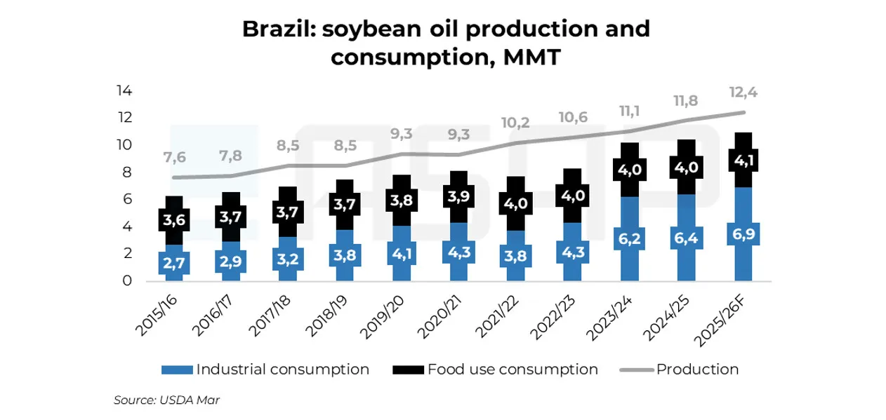 Згідно з прогнозами Міністерства сільського господарства США (USDA), виробництво соєвої олії в Бразилії може зрости до 12,44 млн тонн у сезоні 2025/26, а попит на його промислове використання, включаючи біодизель, — до 6,9 млн тонн проти 4,3 млн тонн у 2022/23.