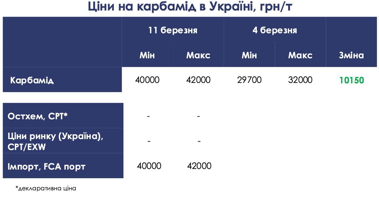 Ціни на карбамід в Україні продовжують рости. Станом на 11 березня імпортний карбамід на умовах FCA порт подорожчав до 40–42 тис. грн/т, що приблизно на 10,1 тис. грн/т більше, ніж тижнем раніше. Про це повідомляє Barva Invest.