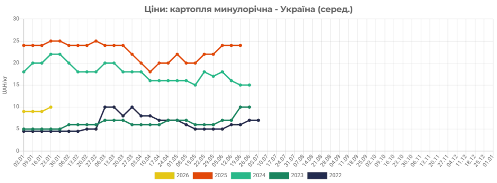 У цьому сегменті ринку ціни залишалися незмінними з середини грудня минулого року. Ба більше, з початку другої декади останнього місяця 2025 року продавці дедалі частіше знижували відпускні ціни на наявні партії картоплі, особливо на ту, що вже не підлягала тривалому зберіганню.