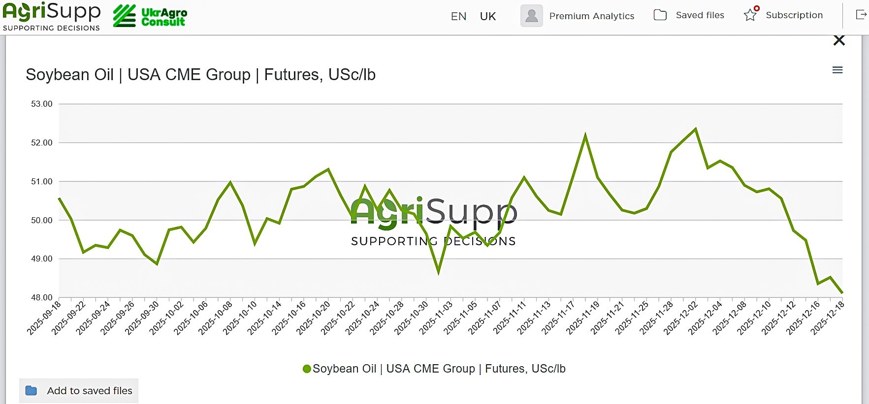 За тиждень 12–18 грудня ціна соєвої олії на Чиказькій біржі знизилася на 2,71 цента — до 48,11 цента за фунт.