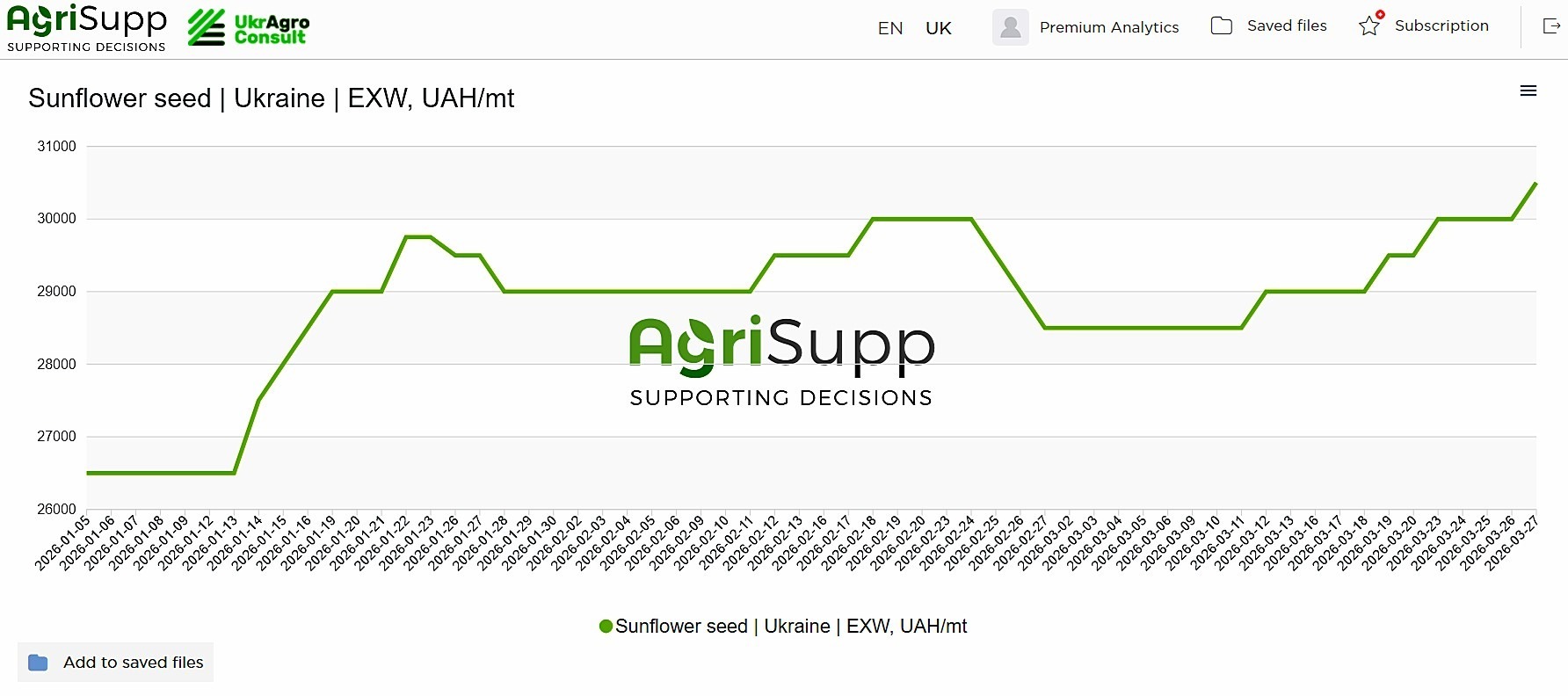 За тиждень 20–27 березня ціна на соняшник зросла на 1000 грн. до 30500,00 грн/т (695,46 дол./т).