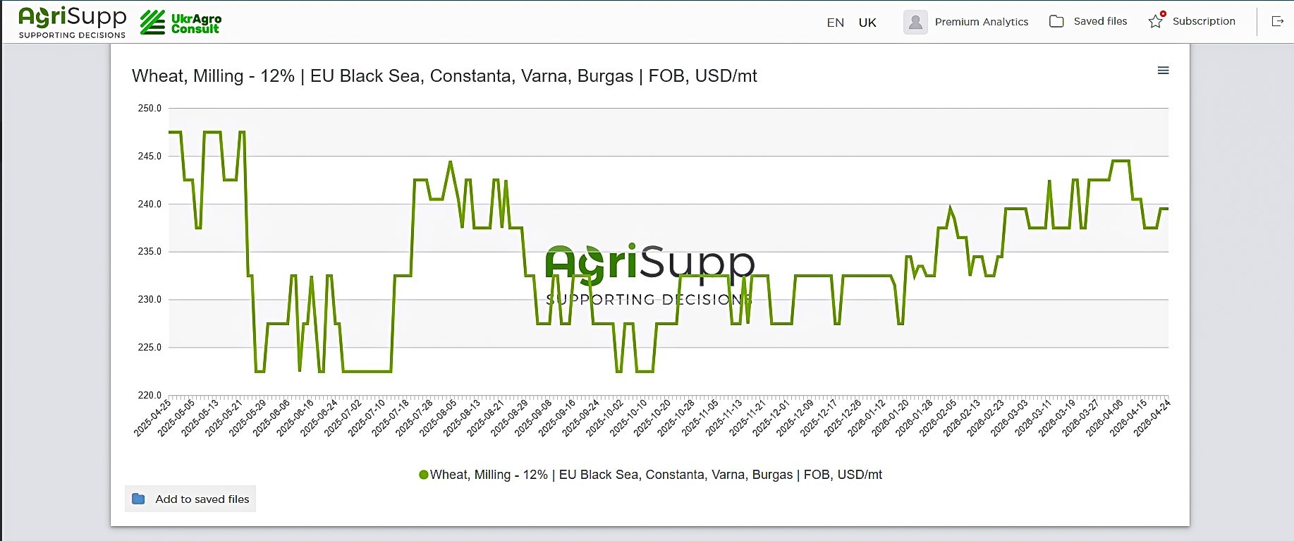 Ціна на румунську борошномельну пшеницю (12%) зросла приблизно на 2 дол./т за тиждень — до 240 дол./т FOB Констанца.