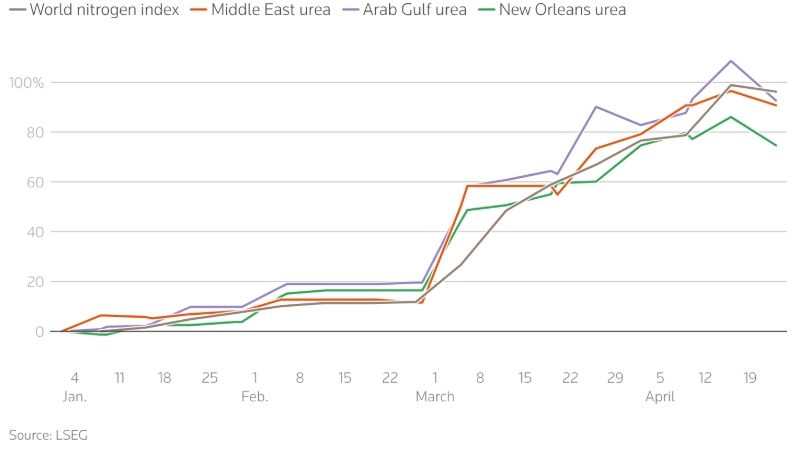 З початку війни ціни на добрива різко зросли, найбільше — на сечовину, що пов’язано з втратою близько третини світового експорту з регіону Перської затоки.
