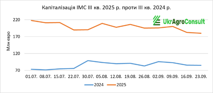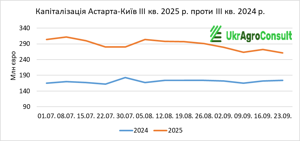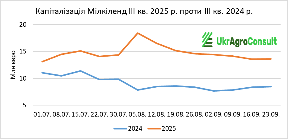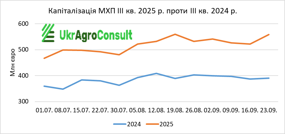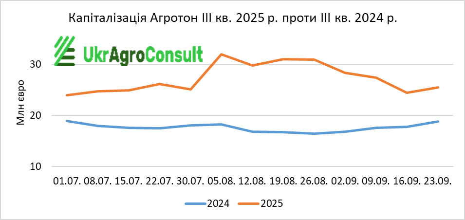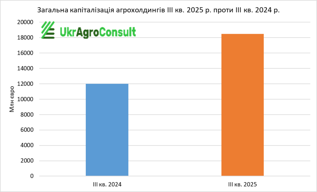 Згідно з біржовими даними та розрахунками УкрАгроКонсалт, загальна капіталізація агрохолдингів (МХП, Кернел, Агротон, Астарта-Київ, Агродженерейшн, Мілкіленд, IMC, KSG Agro, Укрпродукт, Агроліга) за ІIІ кв. 2025 р. склала 18487,35 млн євро, що на 6497,9 млн євро (35,1%) більше, ніж за ІІI кв. 2024 р. (11989,45 млн євро).