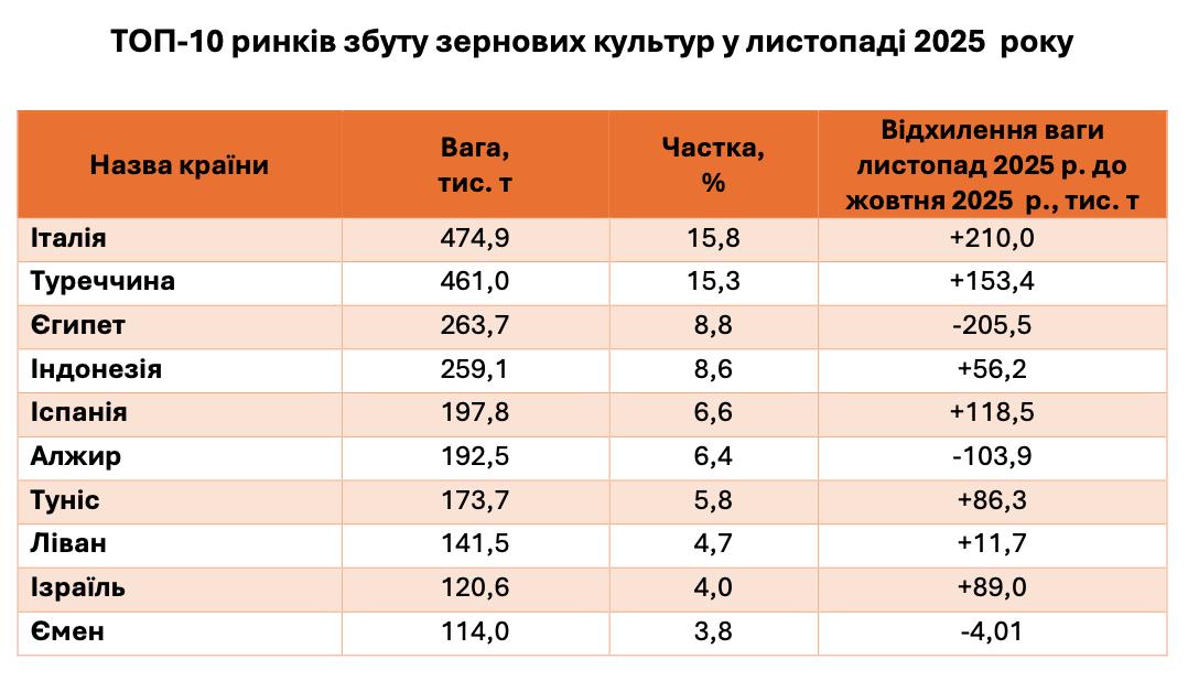 У листопаді Україна переважно експортувала зерно до країн Європи та Близького Сходу. Найбільшим ринком збуту стала Італія, яка забезпечила майже 16% від загальної ваги експорту, значно наростивши закупівлі. Важливу роль відіграла також Туреччина, чия частка становила понад 15%, зміцнюючи позиції регіону Східного Середземномор’я.