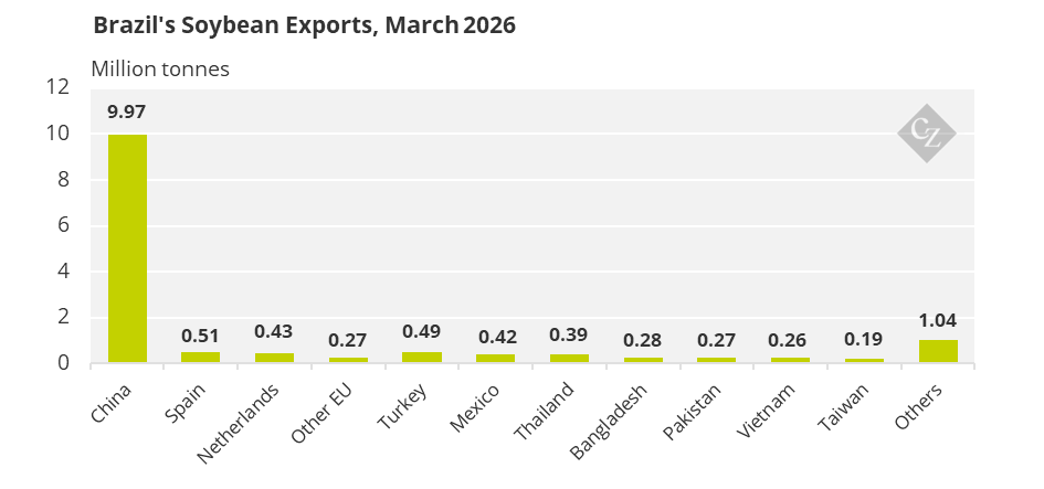 Додатковий тиск на ціни чинить активна експортна кампанія Бразилії. У березні країна поставила на зовнішні ринки 14,5 млн тонн сої, а загальний експорт за перший квартал сягнув 23,47 млн тонн, що перевищує показник минулого року. Хоча Китай залишається головним покупцем із часткою близько 69%, обсяги постачань до нього скоротилися, тоді як експорт до ЄС, Мексики, Бангладеш і Таїланду зріс.