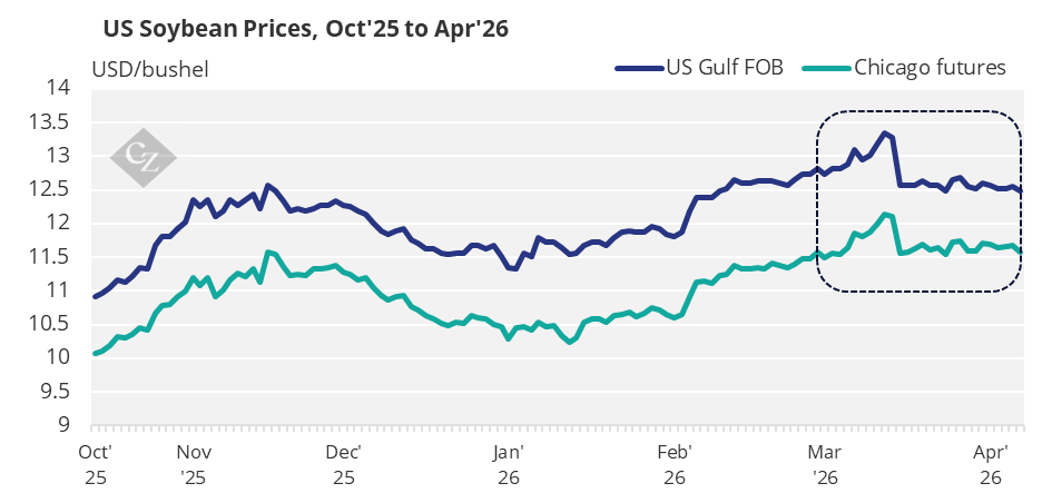 Водночас ризики для попиту з боку Китаю зростають. Очікується, що у травні–липні на ринок країни надійде великий обсяг бразильської сої, що може призвести до перенасичення. Слабке економічне зростання, проблеми у тваринництві та падіння цін на свинину обмежують споживання кормів і соєвого шроту. За таких умов частина бразильського експорту й надалі переорієнтовуватиметься на інші ринки, що разом зі зростанням посівних площ у США посилює тиск на світові ціни на сою.