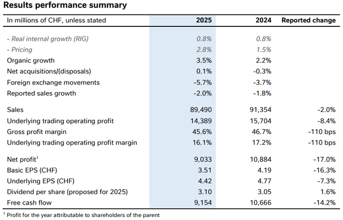 Чистий прибуток Nestle 2025 року склав 9 млрд франків (€9,9 млрд), що на 17% менше, ніж у 2024 році.