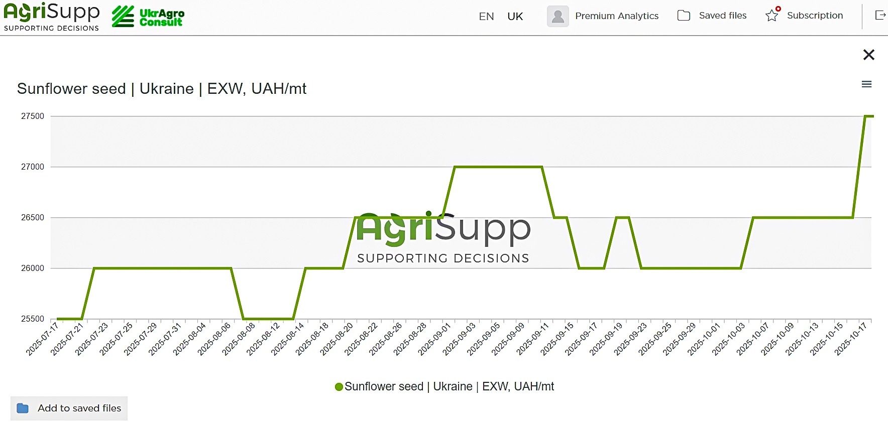 За тиждень 10 – 17 жовтня ціна на соняшник зросла на 1000 грн. до 27500 грн./т.