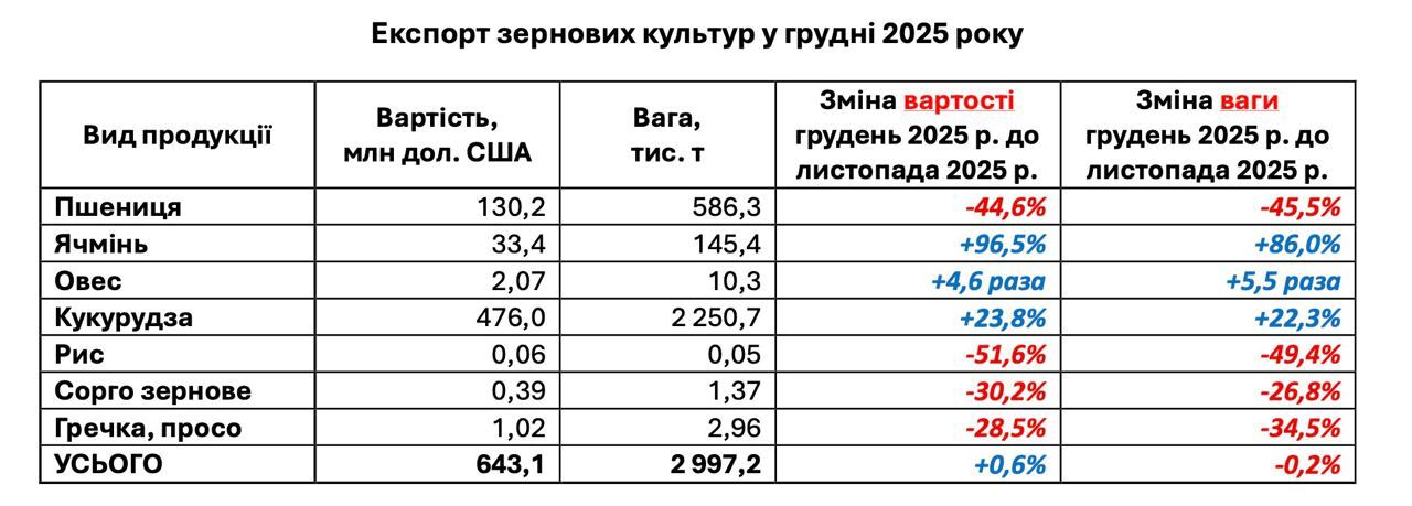 Загалом у грудні Україна експортувала 3 млн т зернових на суму $643 млн. Порівняно з листопадом фізичні обсяги майже не змінилися, водночас у структурі експорту відбулися помітні зсуви між окремими культурами.
