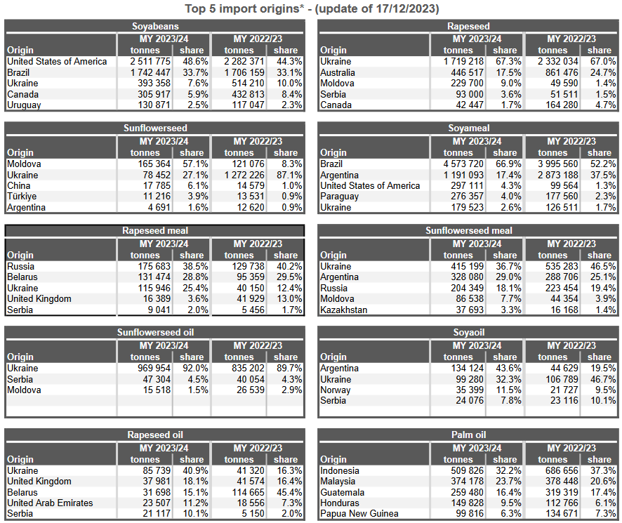 Імпорт соєвого шроту склав 6,83 млн. тонн, що на 11% менше, ніж 7,65 млн. тонн роком раніше, а імпорт пальмової олії склав 1,58 млн. тонн, що на 14% нижче 1,84 млн. тонн роком раніше.