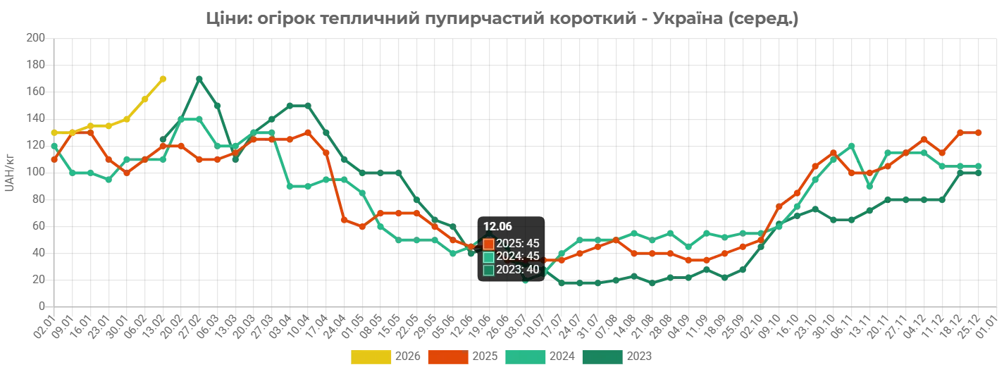 Незважаючи на досить холодну зиму, цього року сезон реалізації огірка нового обігу в Україні розпочався приблизно в ті ж терміни, що й рік тому. Але при цьому вартість цієї продукції в аналогічний період минулого року була в середньому на 14% вищою, ніж на даний момент.