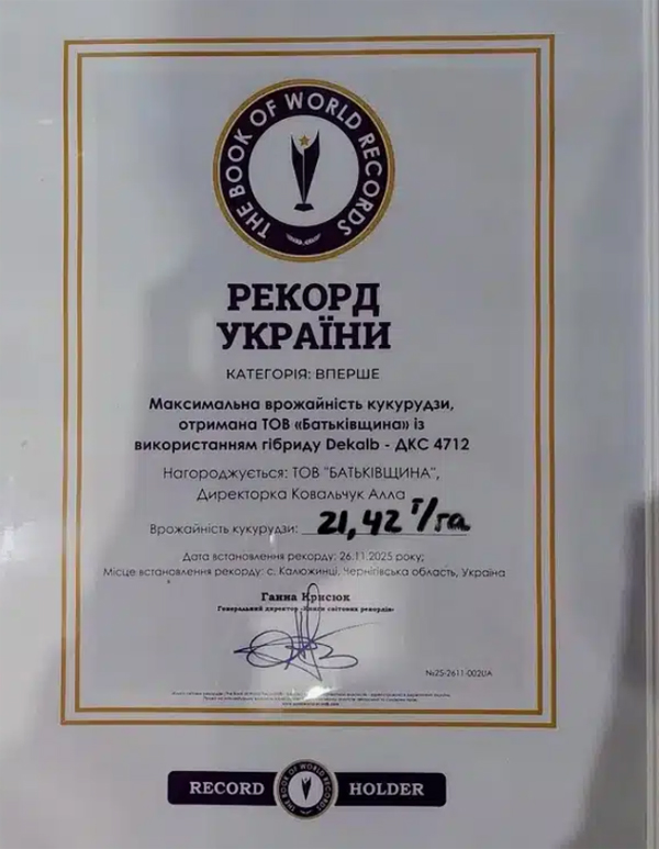 Рекорд встановлено в категорії «Вперше» — максимальна врожайність кукурудзи.