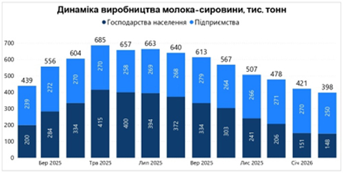 Господарства усіх категорій України у лютому 2026 року виробили 397,6 тис. т молока-сировини, що на 23,6 тис. т менше (-5,6%) відносно січня 2026 року і на 41,1 тис. т менше (-9,4%) відносно лютого 2025 року.