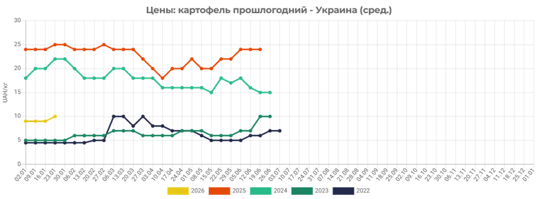 В данном сегменте рынка ценники не менялись с середины декабря прошлого года. Более того, с начала второй декады последнего месяца 2025 года продавцы все чаще снижали отпускные цены на имеющиеся партии картофеля, особенно того, который уже не подлежал длительному хранению.