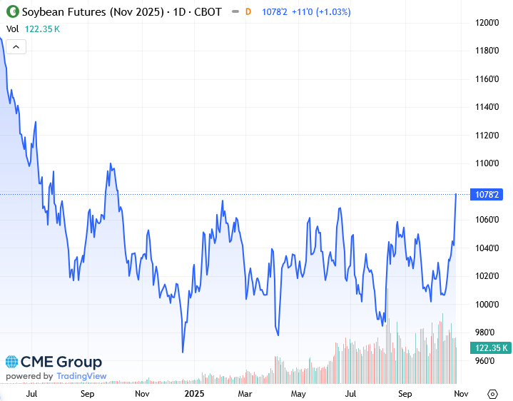 Во вторник фьючерсы на соевые бобы в Чикаго достигли самого высокого уровня за 15 месяцев, ненадолго превысив 11 долларов за бушель на фоне оптимизма относительно того, что США смогут достичь торгового соглашения с Китаем, поскольку ожидается, что лидеры обеих стран встретятся в Южной Корее в четверг.