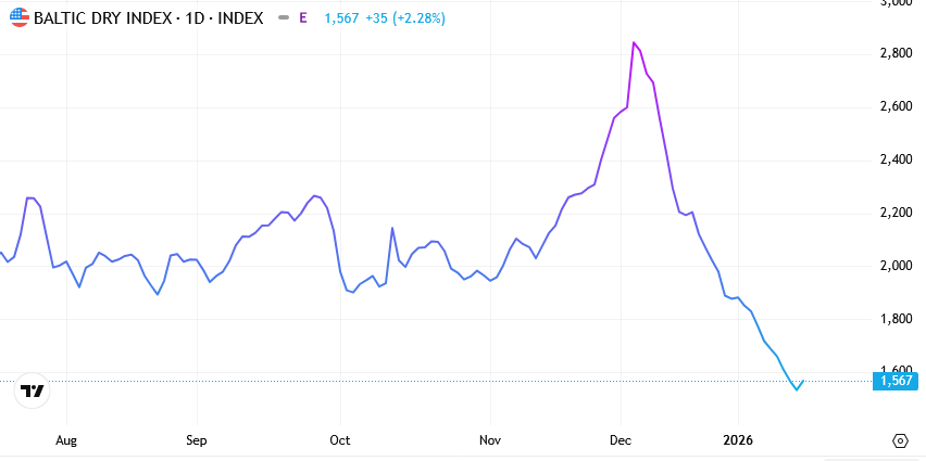 Индекс Балтийской биржи по ставкам на сухие грузы, отслеживающий ставки для судов, перевозящих сухие товары, в пятницу прервал девятидневную серию падений, поднявшись примерно на 2,3% до 1567 пунктов.
