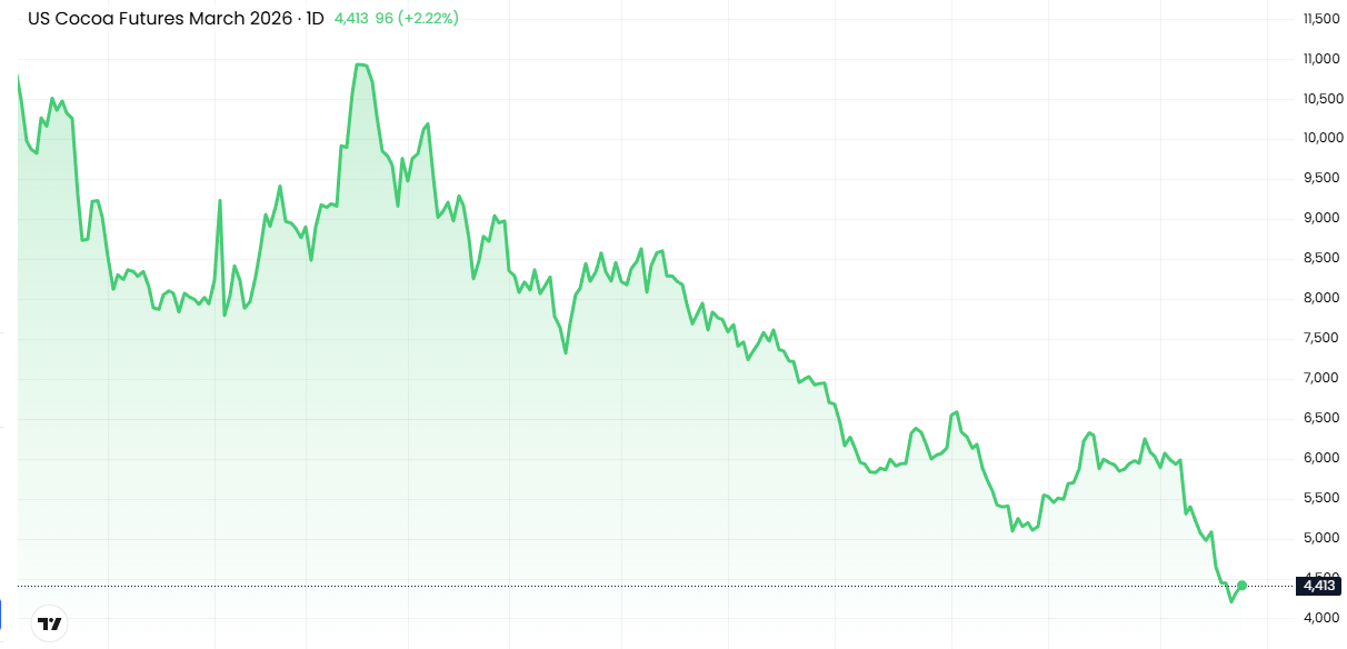 Цена на какао в Нью-Йорке выросла на 85 долларов, или на 2%, до 4433 долларов за метрическую тонну. В конце прошлой недели рынок упал до двухлетнего минимума в 4054 доллара.