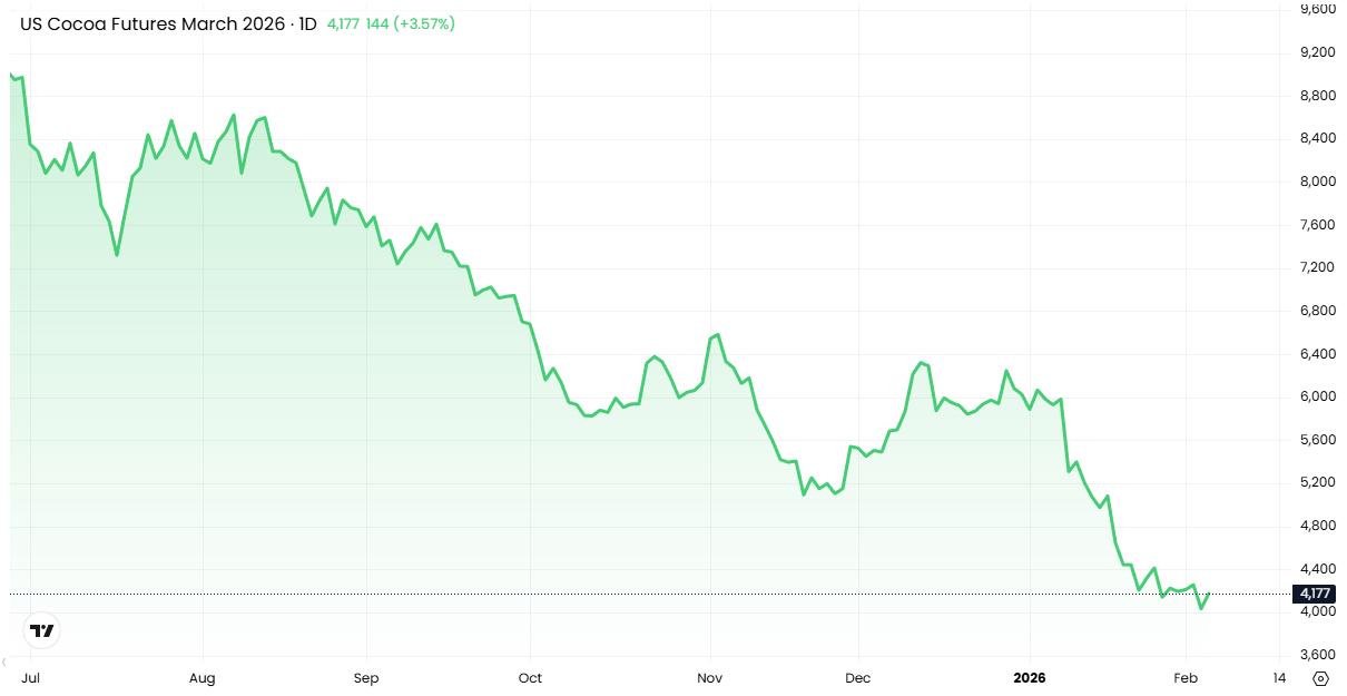 В прошлую пятницу цены на какао в Нью-Йорке упали до ближайшей к 2,25-летнему минимуму, а в Лондоне — до 2,5-летнего минимума, поскольку обильные мировые запасы и вялый спрос оказывают давление на цены на какао. В прошлый четверг компания StoneX спрогнозировала мировой избыток какао в размере 287 000 тонн в сезоне 2025/26 и 267 000 тонн в сезоне 2026/27. Кроме того, Международная организация по какао (ICCO) 23 января сообщила, что мировые запасы какао выросли на 4,2% в годовом исчислении до 1,1 млн тонн.