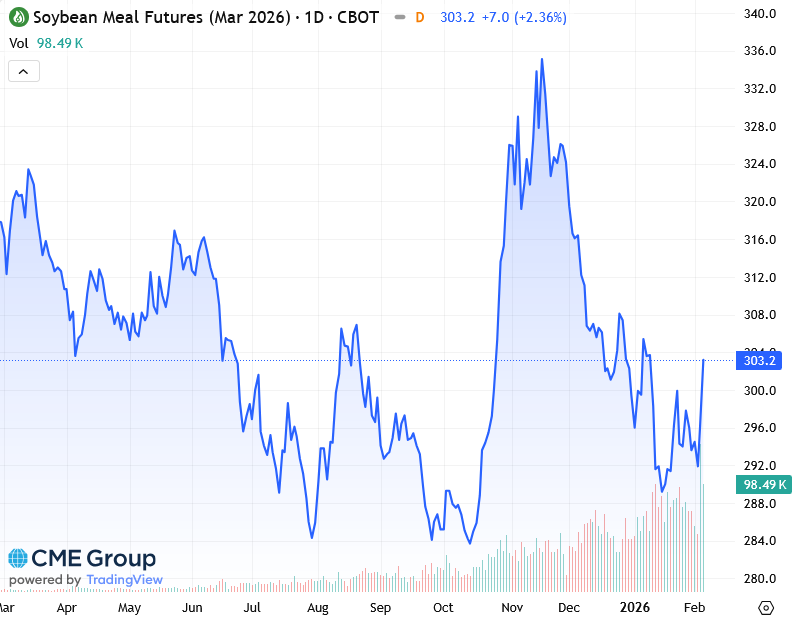 Мартовские фьючерсы на соевый шрот на бирже CBOT закрылись на отметке $7 выше, достигнув $303,20 за короткую тонну.