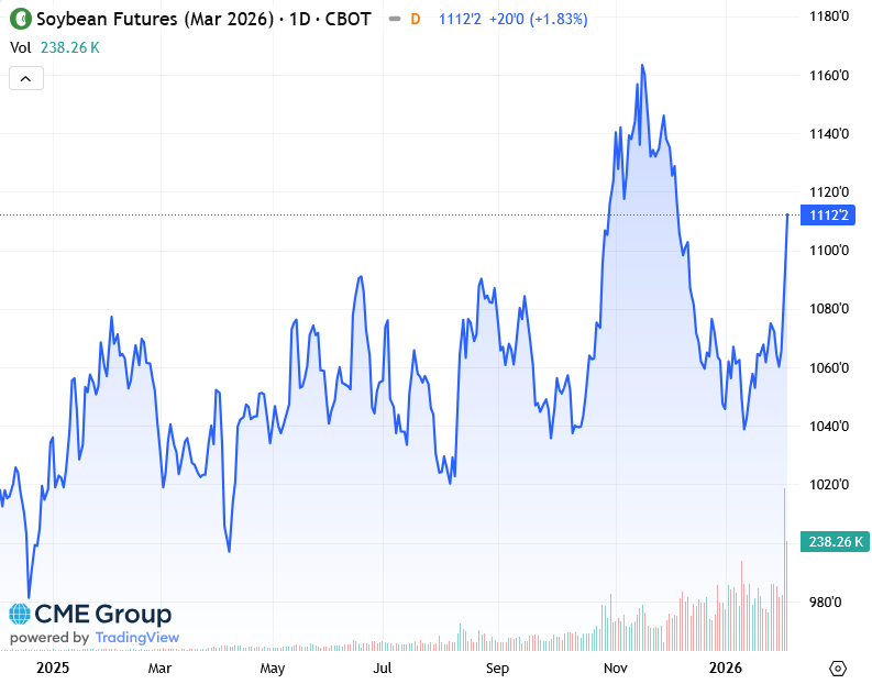 Цены на сою выросли в среду после того, как президент Дональд Трамп заявил, что Китай «увеличивает объем закупок сои до 20 миллионов тонн в текущем сезоне», предполагая, что Китай может закупить 8 миллионов метрических тонн американской сои в сезоне 2025/26 в дополнение к примерно 12 миллионам тонн, уже забронированным с момента заключения торгового перемирия в конце октября.