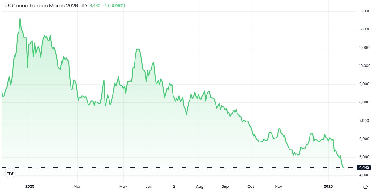В четверг фьючерсы на какао в Нью-Йорке немного выросли, в то время как цены на какао в Лондоне практически не изменились, поскольку стоимость этого ингредиента для производства шоколада осталась на уровне двухлетнего минимума.