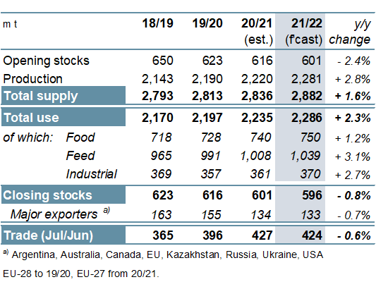Прогнозы спроса и предложения на пшеницу на 2022/23 год аналогичны предварительным прогнозам, опубликованным в прошлом месяце, включая прогнозы рекордного производства и потребления. В то время как мировые конечные запасы в настоящее время, как ожидается, немного увеличатся в годовом исчислении (в годовом исчислении). Первые прогнозы Совета на 2022/23 мировые посевные площади кукурузы и ячменя в целом незначительно изменятся в годовом исчислении. Однако в связи с высокими затратами на вводимые ресурсы, усложняющими расчеты относительной рентабельности яровых культур, прогнозы будут тщательно пересматриваться в предстоящие месяцы.