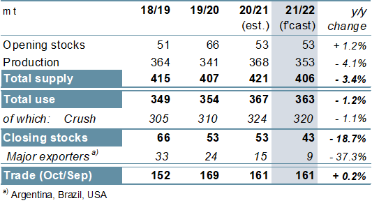 Отражая свидетельства сокращения потенциала урожайности в Южной Америке, прогноз мирового производства сои на 2021/22 год сокращен еще на 15 млн тонн в год до 353 млн тонн (-4% г/г). Чистое сокращение поставок связано с более низкими показателями потребления – впервые за десятилетие наблюдается снижение запасов. Большая часть сокращения запасов будет обусловлена крупными экспортерами, которые сократятся на 7 млн тонн м/м. В связи с ограничением доступности и высокими ценами, которые приведут к некоторому нормированию спроса, прогнозируется снижение объема торговли на 6 млн тонн до 161 млн тонн, что будет стабильно в годовом исчислении. Заглядывая в перспективы на 2022/23 год, Совет предварительно прогнозирует увеличение мировых посевных площадей на 2% в годовом исчислении, включая прирост в основных странах основных экспортеров.