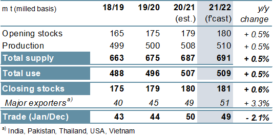 В связи с ростом в Индии и Таиланде мировое производство риса в 2021/22 году, по прогнозам, достигнет пика в 510 млн тонн, что незначительно увеличится в годовом исчислении. На фоне роста спроса на продовольствие, обусловленного ростом населения, а также увеличением использования продуктов питания в Китае, глобальное потребление наблюдается на высоком уровне, в то время как накопление в Индии может поддержать рекордные запасы в 181 млн тонн (+1 млн тонн в год). Торговля в 2022 году (январь/декабрь), по прогнозам, немного сократится по сравнению с пиком предыдущего года, до 49 млн тонн. Однако эту цифру следует рассматривать в контексте – она на 3 млн тонн превышает средний показатель за пять лет.