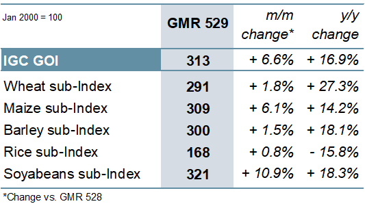 Индекс зерновых и масличных культур IGC (GOI) вырос на 7% до уровня, который в последний раз наблюдался в сентябре 2012 года, при чистом росте на всех рынках.