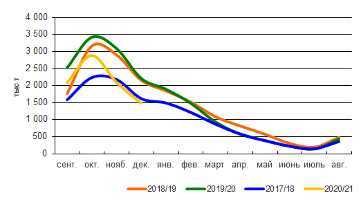 К концу декабря 2020г. запасы подсолнечника в сельхозорганизациях снизились до 1,487 млн., что на 29% меньше, чем месяцем ранее и на 33% меньше, чем в декабре 2019г.