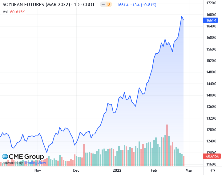 Фьючерсы на соевое масло достигли рекордно высокого уровня из-за опасений по поводу мировых поставок растительного масла на фоне конфликта в крупнейшем регионе производства подсолнечного масла.