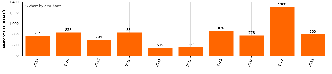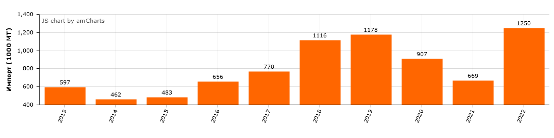 Согласно ноябрьскому прогнозу USDA, Турция в сезоне 2022/2023 может значительно увеличить импорт подсолнечника до 1250 тыс. тонн (+581 тыс. тонн. +86.85%) к сезону 2021/2022, в свою очередь импорт подсолнечного масла может сократится до 800 тыс. тонн (-508 тыс. тонн -38.84%).