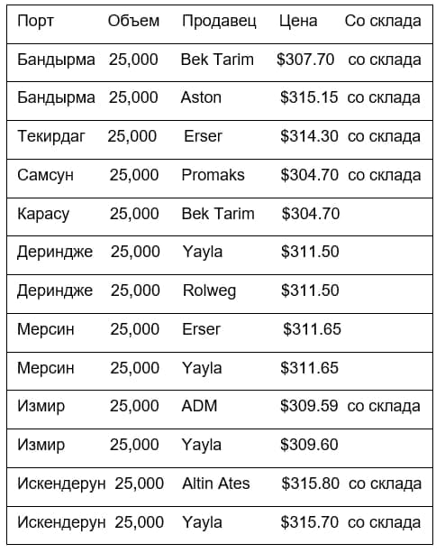 Трейдеры сообщили о следующих предварительных закупках с указанием порта выгрузки, объема в тоннах, продавца, цены в долларах за тонну C&F и о поставке со складов в Турции: