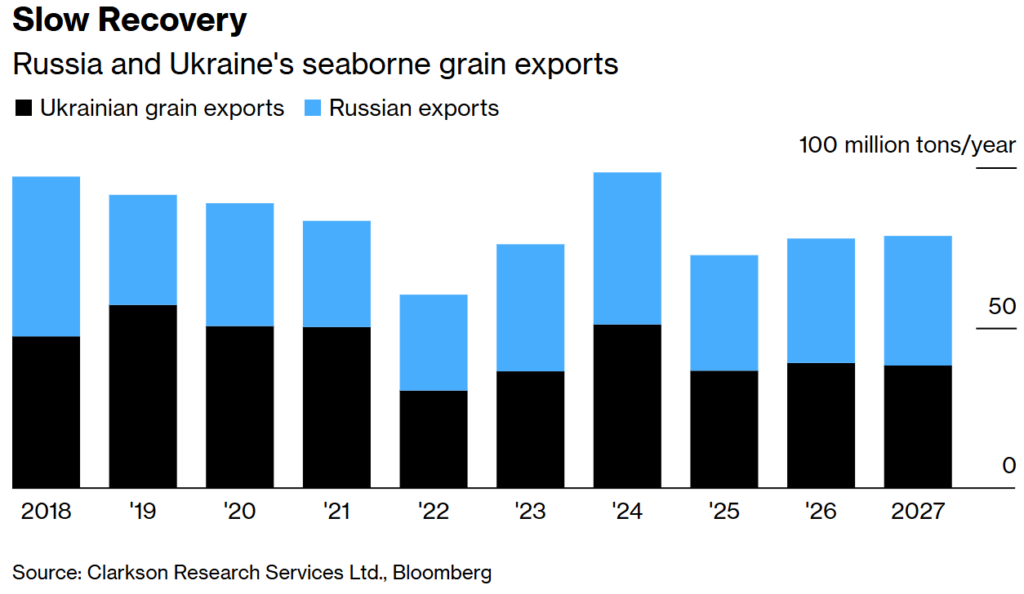 Относительно цен на сельскохозяйственную продукцию потенциальное мирное соглашение может успокоить рынки, но, вероятно, принесет ограниченные изменения в ближайшей перспективе. По данным Clarkson Research Services Ltd., подразделения крупнейшего в мире судостроительного брокера, на Украину и россию до сих пор приходится около 14% рынка морских перевозок зерна.