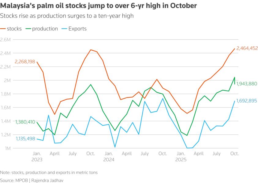 По прогнозу аналитиков Reuters, запасы должны составить около 2,44 млн тонн, однако фактический показатель превысил ожидания. Эксперты отмечают, что в ноябре производство может начать снижаться, но на цены будет влиять спрос на экспорт, ведь пальмовое масло пока дешевле других растительных масел.